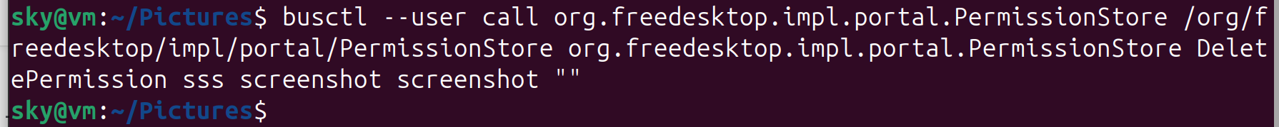 $busctl --user call org.freedesktop.impl.portal.PermissionStore /org/freedesktop/impl/portal/PermissionStore org.freedesktop.impl.portal.PermissionStore DeletePermission sss screenshot screenshot ""